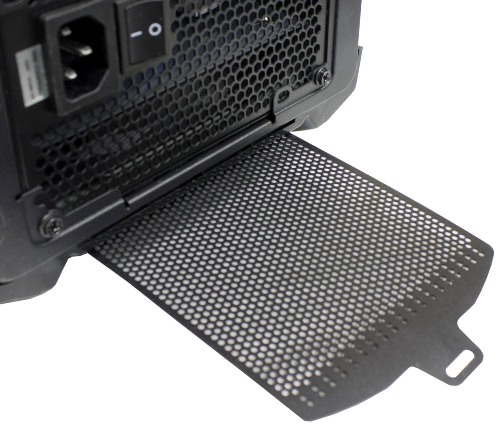 На днище розробники передбачили гумові опори, відмінно утримують корпус на поверхні столу. Але їх висота невелика, що створює перешкоди повітрообміну, тому блок живлення бажано розвернути вентиляційною сіткою всередину системного блоку. І це незважаючи на те, що більшу частину днища займає вентиляційна решітка, прикрита пиловим фільтром для блоку живлення і опціонально встановлюється вентилятора. Кріплення пилового фільтра здійснюється до піддону, а невелике подовження в місці хвата дозволяє користувачеві без праці вийняти фільтр для подальшого очищення струменем гарячої води. Зроблено фільтр з міцного пластику, але діаметр отворів становить значні два міліметри, що не дуже ефективно перешкоджає проходженню пилу.