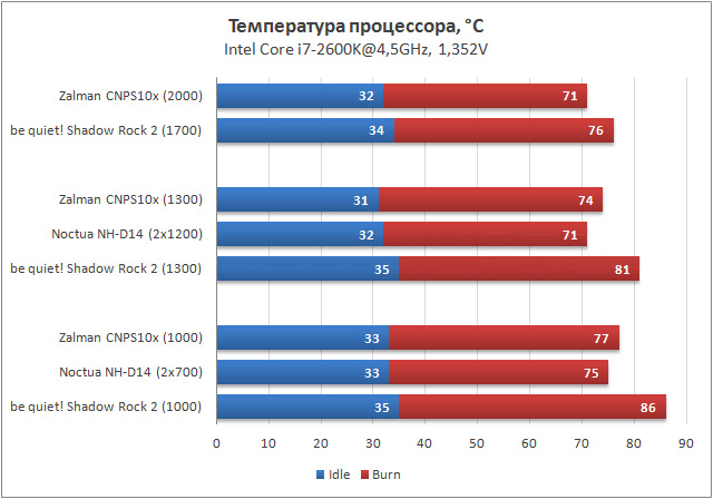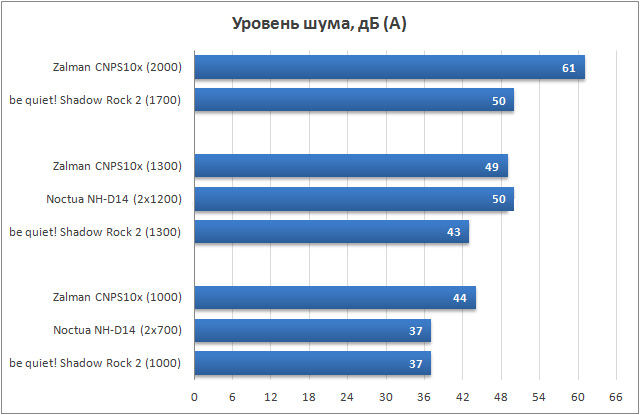 Порівняння ефективності кулерів виконувалося по співвідношенню температури до рівня шуму і швидкості оборотів вентилятора. Продукція компанії be quiet! ще раз виправдала справедливість своєї назви, кулер Shadow Rock 2 виявився тихим серед випробовуваних. Йому вдалося виграти у опонентів цілих 7 дБ при однакових швидкостях крильчаток. Результат просто приголомшливий!