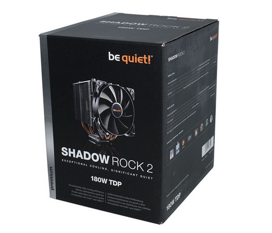 Система охолодження be quiet! Shadow Rock 2 продається в картонній упаковці виконаної з картону. Дизайнери віддали перевагу чорному кольору, який є основним. На його тлі ефектно виглядають зображення і написи.