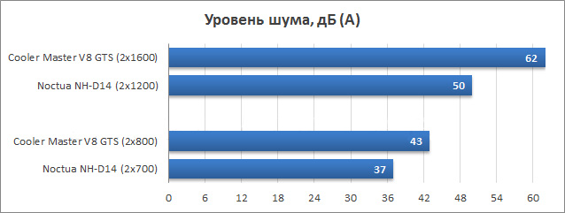 На діаграмі ви можете бачити показники обох піддослідних. Cooler Master V8 GTS явно програє Noctua NH-D14 навіть на мінімальній швидкості. Він впевнено перевищує поріг в 40 дБ, який вважається умовно безшумним. На максимальних обертах гул кулера знову викликає асоціації з потужним автомобілем, але в цьому випадку вони навряд чи викличуть захоплення.