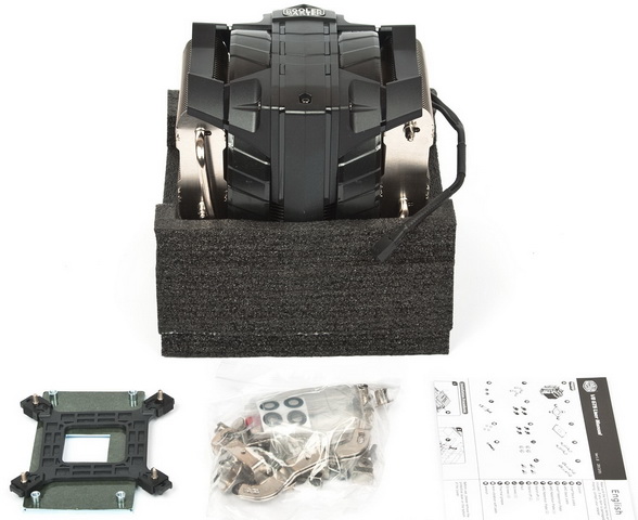 Відкривши упаковку, ми виявили що лежить під кришкою білу коробочку з аксесуарами. Що знаходиться під нею кулер виявився надійно захищеним від пошкоджень: його оточують два досить щільних демпфера чорного кольору. Приємно, що виробник турбується про збереження своїх виробів і нервах покупців.
