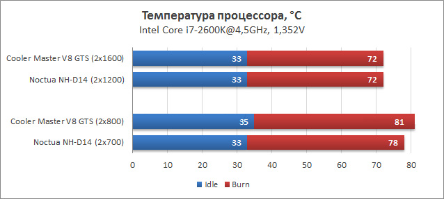 З ефективністю охолодження ситуація набагато краща. Обидва кулера показали приблизно однакові результати, особливо на максимальних обертах. В даному режимі Cooler Master V8 GTS виявився на цілих 12 дБ голосніше Noctua NH-D14. У тихому режимі розрив становить 6 дБ і три градуси Цельсія.