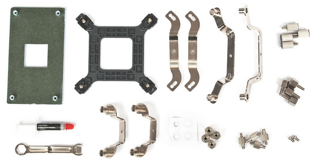 Для сокетів Intel призначені окрема підсилювальна пластина, кріпильні лапи, два набори стійок (для гнізд LGA 775 / 115x / 1366 і LGA 2011), кріпильні гайки і гвинти.