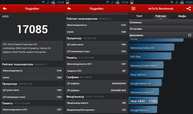 Завдяки хорошій оптимізації пристрій працює швидко і плавно, що підтверджують і результати синтетичних тестів. У AnTuTu Benchmark смартфон набрав 17085 балів. Приблизно такі ж результати демонструють такі популярні девайси, як Samsung Galaxy S3 і LG Google Nexus 4, які стоять на порядок дорожче китайського апарату.