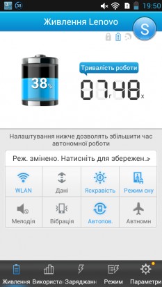 У пристрої є досить корисний додаток - менеджер батареї. Програма дозволяє збільшити час автономної роботи девайса. Менеджер батареї містить в собі п'ять вкладок. На першій вкладці можна побачити, що залишився роботи смартфона. Тут же можна знизити рівень яскравості, гучність, відключити бездротові модулі і енергоємні функції (вібрацію, автоповорот екрану тощо).