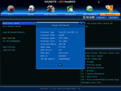 Оновлена ??фірмова технологія «Gigabyte 3D BIOS» заслуговує усіляких похвал. Особливо порадує професійних користувачів спадкоємність нового «BIOS» по відношенню до його попередніх його версій. Якщо що-небудь не вийшло в візуальному режимі, то можна зробити і по-старому. Вражає робота з профілями налаштувань, можливість їх запису на зовнішні носії та автоматичне створення при успішному старті системи. Крім того, якщо користувач зберіг останні внесені зміни в режимі «3D Mode», то цей режим автоматично буде обраний системою при наступному вході в «BIOS». В іншому випадку вхід відбудеться в режимі «Advanced Mode».