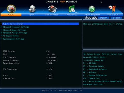 В «BIOS» збережена працездатність гарячих клавіш. Наприклад, при натисканні клавіші «F9» видається інформація про систему. А клавіша «F8» задіє фірмову технологію оновлення прошивок під назвою «Q-Flash». Тепер вона стала більш простою в освоєнні і дає знати користувачу інформацію як про встановлену на його комп'ютері версії «BIOS», так і про останньому оновленні «BIOS», доступному для завантаження з офіційного сайту виробника.