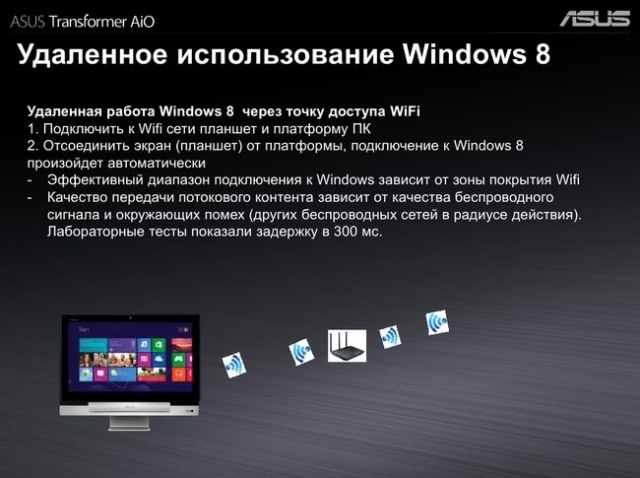 Крім звичної роботи з моноблоком або планшетом ASUS Transformer AiO може запропонувати дещо незвичайне. При наявності вдома або в офісі Wi-Fi мережі можна здійснювати роботу в Windows 8 на отсоединенном планшеті.