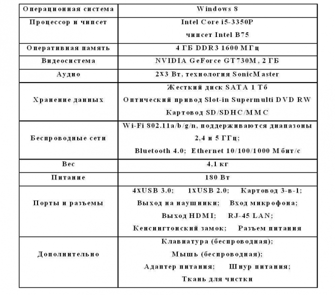 У моноблоці встановлений чотирьохядерний процесор Intel Core i5-3350P. Його номінальна частота роботи становить 3,1 ГГц з можливістю розгону до 3,3 ГГц. Як відеопідсистеми виступає дискретна відеокарта Nvidia GeForce GTX 730М, яка призначена для ноутбуків середнього класу. Пограти в сучасні ігри, з роздільною здатністю 1920 х 1080, можливо тільки при мінімальному якості графіки. Для більш детальної оцінки продуктивності приведу результати тестів PC Mark7, Cinebench і 3DMark.