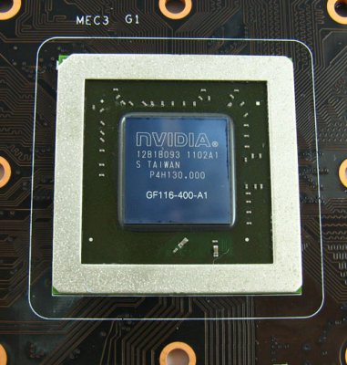 У центрі плати знаходиться графічний чіп GF116-400-A1, а за допомогою програми GPU-Z можна розглянути всі характеристики даного чіпа.