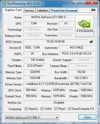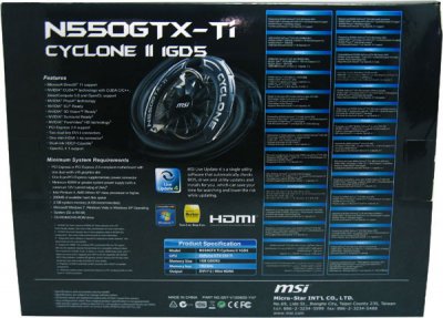 Модель відеокарти: MSI N550GTX-TI CYCLONE II 1GD5 / OC. Є підтримка DirectX 11 з Shader Model 5.0 і OpenGL 4.0, також підтримуються фірмові технології nVidia CUDA, nVidia PhysX, nVidia SLI, nVidia PureVideo і nVidia 3D Vision.