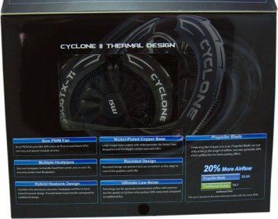 Система охолодження на відеокарті встановлена ??фірмова під назвою CYCLONE II. Система складається з трьох алюмінієвих радіаторів об'єднаних за допомогою двох теплових трубок і 90 мм вентилятора з підтримкою ШІМ регулювання швидкості обертів. Охолодження здійснюється за допомогою мідної пластинки, яка кріпиться до графічного чіпу і відводить тепло через трубки до радіаторів, де їх охолоджує вентилятор. Всі деталі радіатора ретельно спаяні і покриті нікелем.