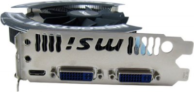 На передній частині графічного прискорювача виробник вивів два порти DVI-I і один mini-HDMI. Також тут трохи вище портів є невелика решітка у вигляді логотипу компанії для відводу теплого повітря з корпусу. Компанія MSI майже завжди використовує такі грати на всіх своїх відкритих.