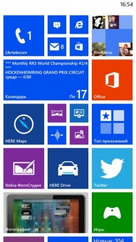 Робочий стіл досить інформативний - на ньому можна розміщувати значки практично всіх програм. Крім того, користувачеві Nokia Lumia 1320 надається можливість виносити на даний елемент інтерфейсу так звані "плитки", інформація на яких буде постійно оновлюватися в автоматичному режимі. Що стосується налаштувань, то можна змінити колірну забарвлення значків і колір фону.