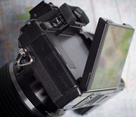 Olympus OM-D E-M1 оснащена сенсорним поворотним дисплеєм, побудованим на основі звичайної TFT-матриці. Її діагональ становить 3 дюйми, а роздільна здатність - 1 040 000 пікселів. Екран повертається лише у вертикальній площині. Його можна нахиляти на 50 градусів вниз і на 80 градусів вгору. Дисплей фотокамери яскравий і точно передає кольори, але в умовах яскравого сонячного освітлення в процесі зйомки варто використовувати видошукач. Кути огляду у екрану апарату досить широкі.