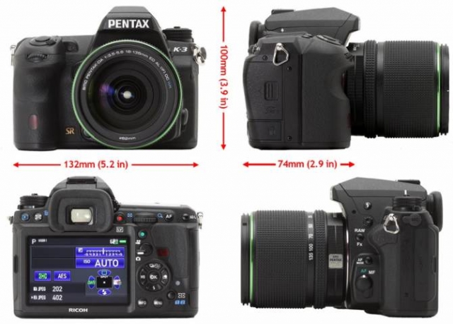 Розміри пристрою становлять 100х131,5х77, 5 міліметрів. Важить камера разом з картою пам'яті і акумуляторною батареєю 800 грам. Розміри Canon EOS 70D становлять 104х139х78,5 при масі 755 грам, Sony A77 має габарити 104х143х81 міліметрів при вазі 732 грами. Nikon D7100 має розміри 107х136х76 міліметрів при вазі 765 грам. Порівнявши розміри Pentax K-3 з конкурентами з однієї цінової категорії можна зробити висновок, що камера володіє середніми габаритами. Камера досить важка. Вона важче своїх конкурентів приблизно на 50 грам. Власнику апарату потрібно буде враховувати чималу вагу «тушки», до якого додасться вага оптики.