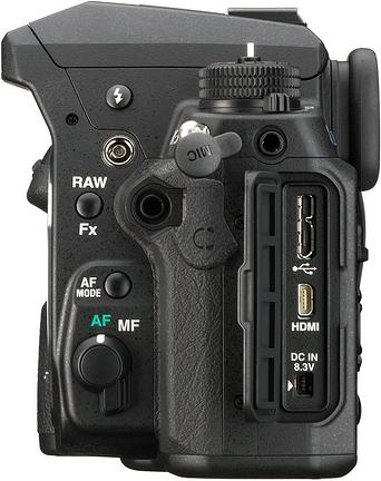 На лівій боковині фотокамери знаходяться отвори для підключення навушників (динаміків) та зовнішнього стереомикрофона, порти USB 3.0 і microHDMI, а також роз'єм для підключення зарядного пристрою. Ближче до передньої панелі розташовуються додаткові елементи управління: важіль перемикання способів фокусування (автоматично або вручну), клавіша RAW / Fx і кнопка AF mode, при натисканні на яку переднім селекторним диском можна вибирати режим автофокусування, а заднім - зону автофокусу (1 точка, 9 точок або 27 точок).