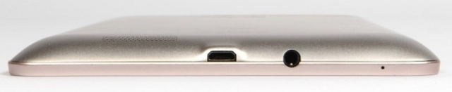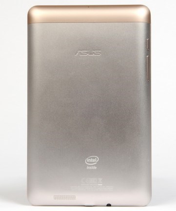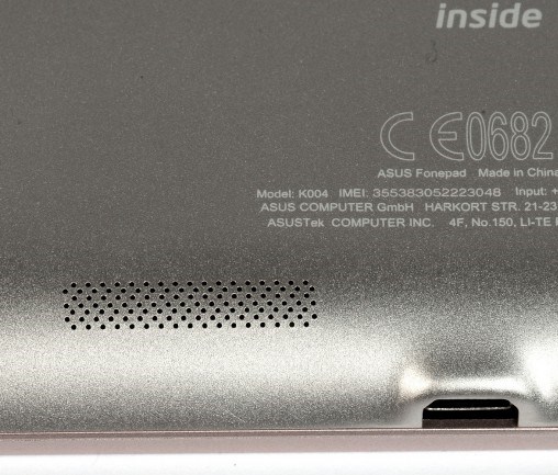 Тильна сторона планшета ASUS Fonepad зроблена з анодованого алюмінію з практичним софт-тач покриттям. У верхній частині тильної поверхні розташований теснённий логотип ASUS, а в нижній - інформація про те, що пристрій побудовано на базі чіпа Intel Inside. Краї пристрої сильно округлені, а тому пластикові бічні грані мають товщину всього три міліметри.