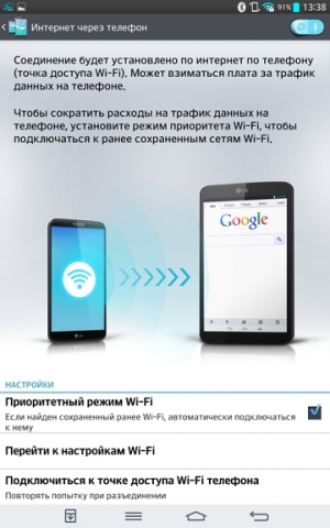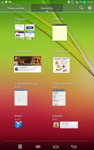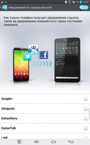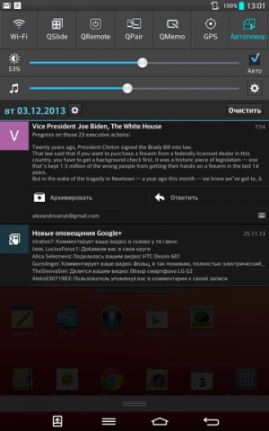 Панель повідомлень, так само, як і в смартфонах, відкривається на всю площу екрана. На панелі сповіщень можна ознайомитися з новими повідомленнями, вручну налаштувати, використовуючи відповідні повзунки, яскравість підсвічування дисплея і гучність мультимедійного динаміка, перейти до меню налаштувань і, звичайно ж, з панелі сповіщень можна здійснювати управління роботою бездротових модулів і деяких режимів. Варто відзначити, що в меню налаштувань користувач може обрати, які іконки варто відображати на панелі повідомлень, а які йому не потрібні, а також встановити порядок відображення цих самих іконок.