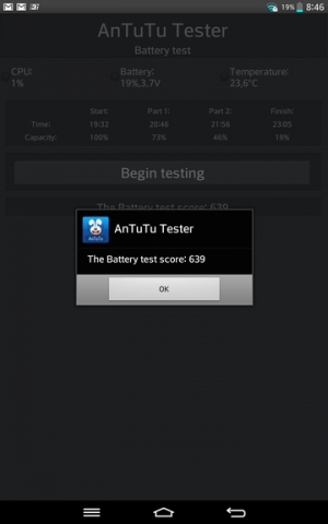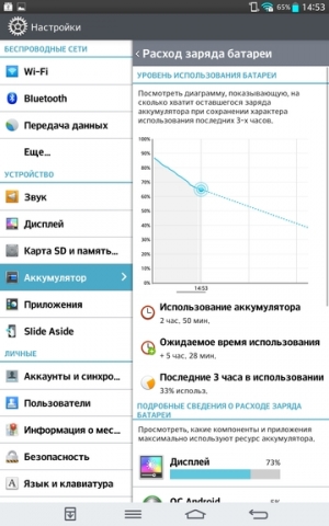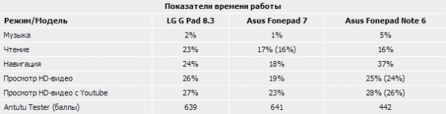 Автономну роботу планшетного комп'ютера LG G Pad 8.3 забезпечує незнімна акумуляторна батарея ємністю 4600 мАг. У синтетичному тесті продуктивності акумуляторної батареї Antutu Tester пристрій набрало 639 балів. Під максимальним навантаженням «таблетка» пропрацювала без підзарядки, розрядившись зі 100% до 15% трохи менше чотирьох годин. Якщо ж використовувати мультимедійні можливості пристрою помірно, то від одного заряду модель LG G Pad 8.3 пропрацює до трьох діб.