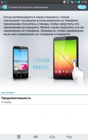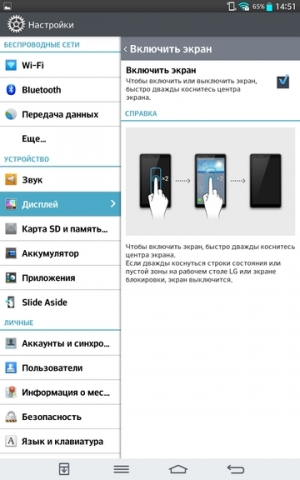 Планшетний комп'ютер LG G Pad 8. 3 підтримує фірмову функцію «Тук-тук», яку ми вперше могли побачити і випробувати в смартфоні LG G2. Ця функція дозволяє розблокувати планшет подвійним тапом по поверхні екрану «сплячого» пристрою, а також заблокувати його подвійним тапом по вільній від ярликів і віджетів поверхні одного з робочих столів.