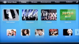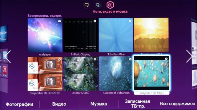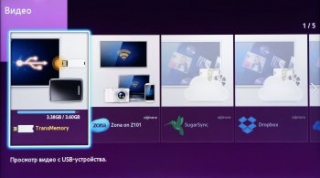 Розділ «Фото, відео, музика »є своєрідною вітриною вбудованого програвача. На екрані виводяться посилання на недавно відтворювані файли з мережевих і підключених USB пристроїв, а також тут можливий доступ до записаних ТВ-програм. Вбудований медіаплеєр відтворює практично всі формати за винятком ISO-образів.