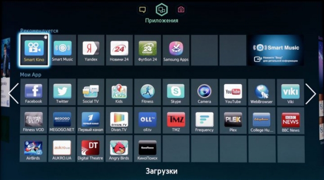 На сторінці «Додатки» зібрані різні програми. Серед уже встановлених - фірмові програми Smart Kino та Smart Music, інші можна встановити самостійно. Платформа підтримує роботу з усіма популярними службами - all.tv, divan.tv, MeGoGo.