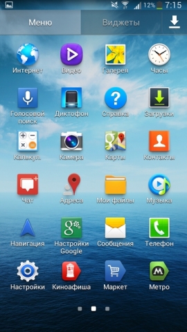 Головне меню представлено матрицею іконок 6х4. Значки додатків прокручуються в горизонтальному напрямку. У верхній частині екрану знаходяться вкладка «Віджети» і іконка, що відкриває список завантажених додатків.