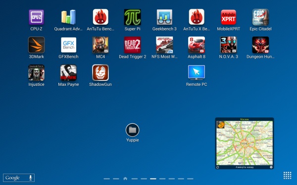 У правому нижньому куті робочого столу можна побачити ікону входу в головне меню, яке складається з трьох вкладок - «Додатки», «Віджети» і «Завантажені програми». Поруч з назвами вкладок знаходиться віртуальна кнопка з трьома крапками, яка дозволяє впорядкувати ярлики програм та ігор, створити нову папку, видалити окремі додатки.