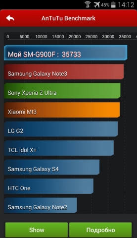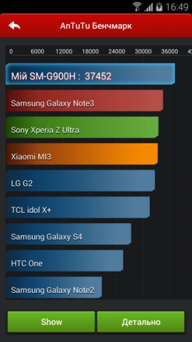 У тесті продуктивності AnTutu смартфон б'є всі рекорди незалежно від апаратної «начинки». Версія з чіпсетом від Qualcomm набирає 35733 бали, а версія на базі Exynos 5 Octa 5422 набирає трохи більше - 37452. За результатами бенчмарків пристрій випереджає всіх своїх конкурентів. У графічному тесті Epic Citadel в режимі Ultra High Quality демонструє результат 53,2 кадру в секунду.
