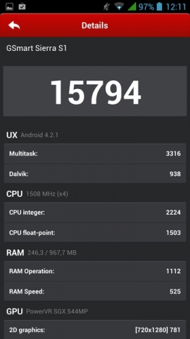 Працює смартфон Gigabyte Gsmart Sierra S1 під управлінням операційної системи Android 4.2.1 в «чистому» вигляді. Як і більшість інших китайських виробників, компанія Gigabyte не встановлює на свої смартфони фірмову оболонку. Можливо, саме цей факт і дає їм змогу з «начинкою» будь-якої продуктивності працювати швидко.