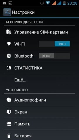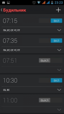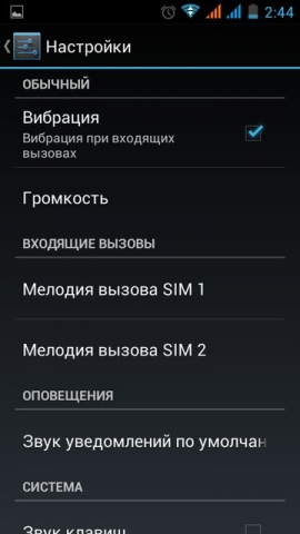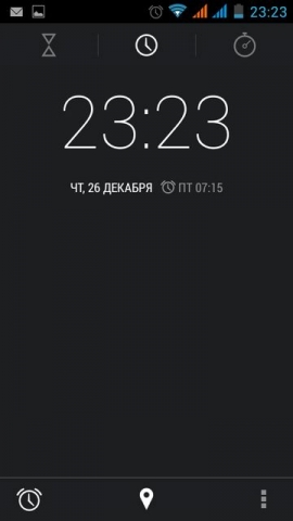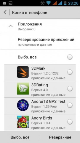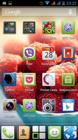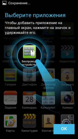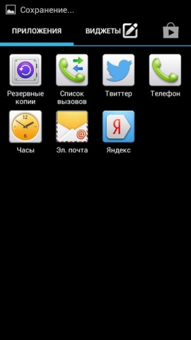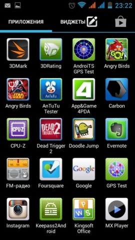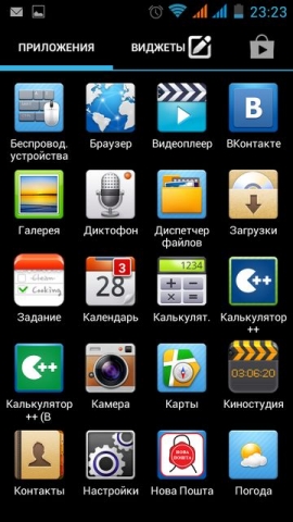 Меню програм розділено на три розділи - «Додатки», «Віджети» і «Play Market». У розділі програми зібрані ярлики всіх встановлених на смартфон додатків. У розділі «Віджети» містяться всі доступні користувачеві віджети. Натиснувши на іконку магазину додатків Play Market, якщо є доступ до мережі Інтернет, користувач переходить до магазину додатків.
