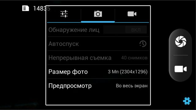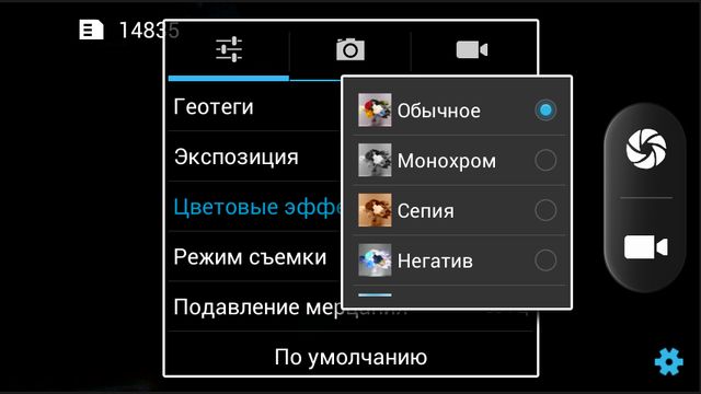 У правій частині видошукача розташована пара кнопок - затвора фотокамери і відеокамери. Користувач не повинен тягнути якийсь повзунок, щоб переключити режим зйомки, так як йому досить просто натиснути на затвор, який відповідає за тип фіксації даних, який необхідний в даний окремо взятий момент часу. Також в правій частині видошукача знаходяться іконка переходу до галереї і іконка переходу до налаштувань камери. У лівій частині видошукача розташовані піктограми, що відповідають за швидку коригування самих затребуваних на думку виробника налаштувань - «Режим зйомки», «Ефект гарного обличчя» і «Експозиція».