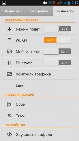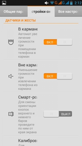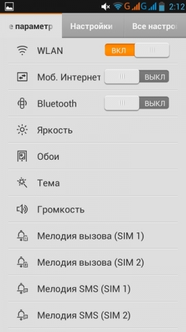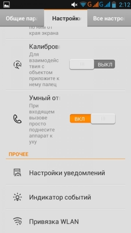 Пункт «Налаштування» так само, як і панель повідомлень, розділений на три вкладки. У першій вкладці містяться загальні параметри, такі як яскравість підсвічування екрану, бездротові модулі, а також управління звуковими сигналами. У другій вкладці знаходяться параметри управління світловим індикатором подій і настройки управління жестами. У третьому пункті меню «Налаштування» знаходяться всі інші стандартні настройки системи.