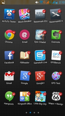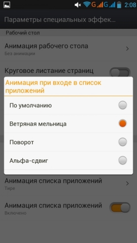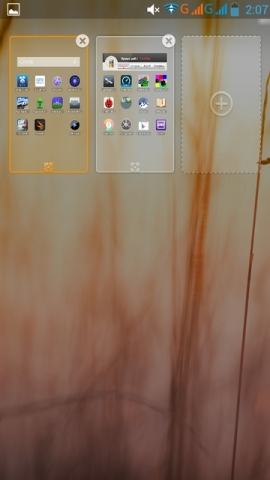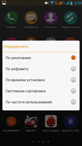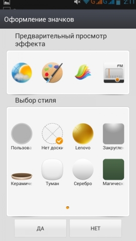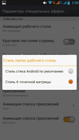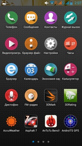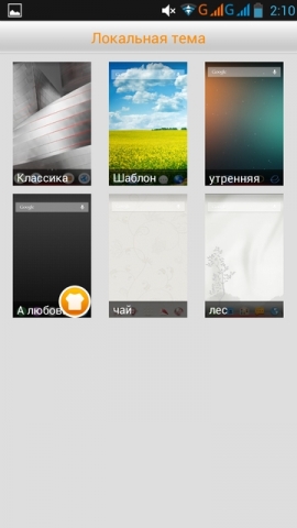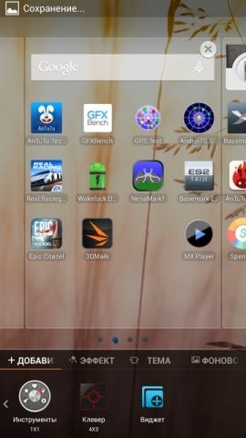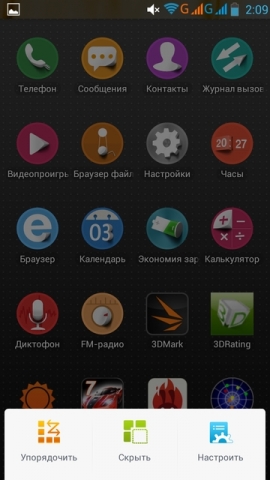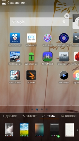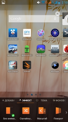 У меню додатків знаходяться тільки ярлики встановлених користувачем або попередньо встановлених виробником програм. Для виклику меню з віджетами необхідно кілька секунд утримувати палець на вільному місці одного з робочих столів. В цьому ж меню можна здійснити вибір теми оформлення або анімаційних ефектів. Варто також відзначити, що зміна теми призводить до зміни не тільки шпалер робочого столу, але і оформлення всіх ярликів встановлених додатків.