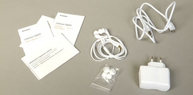 Поставляється смартфон Lenovo IdeaPhone S920 в невеликій картонній коробці білого кольору, що має досить привабливий і незвичайний орнамент, який зазвичай мають деякі види подарункових упаковок. На лицьовій стороні коробки намальований сам смартфон, а на тильній написані його докладні технічні характеристики. Крім самого смартфона в коробці комплекту поставки знаходяться мережевий адаптер (силою 1А), кабель USB-microUSB, гарнітура з амбушюрами вакуумного типу і плоским проводом, комплект з двох пар амбушур різного розміру і стандартний набір супровідної документації. Кабелю OTG в комплекті поставки немає, на відміну від флагманської моделі Р-серії - смартфона Lenovo IdeaPhone P780.
