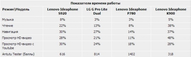 Автономну роботу смартфона Lenovo IdeaPhone S920 забезпечує знімна літієво-іонна акумуляторна батарея ємністю 2250 мАг. У синтетичному тесті продуктивності акумулятора Antutu Tester смартфон набрав 616 балів. Результати тесту підтверджують середній рівень автономності. Якщо використовувати смартфон виключно для дзвінків і відправки повідомлень, то без підзарядки він зможе пропрацювати до трьох днів. Якщо помірно використовувати всі мультимедійні можливості пристрою, то модель IdeaPhone S920 зможе автономно пропрацювати одну добу. З огляду на те, що смартфон має дисплей з діагоналлю 5,3 дюйма і не використовує жодного програмного забезпечення, оптимизирующего енергоспоживання, то його автономність можна вважати досить високою.