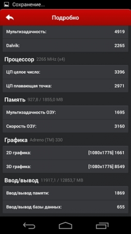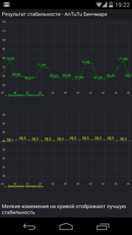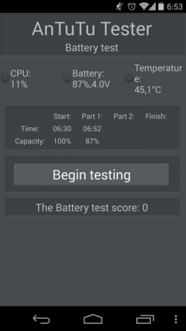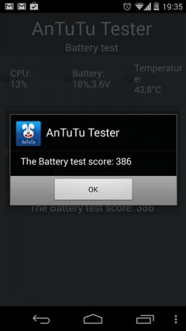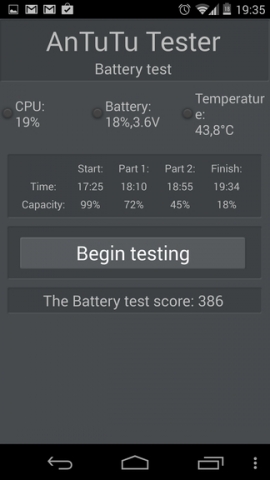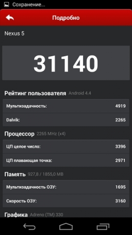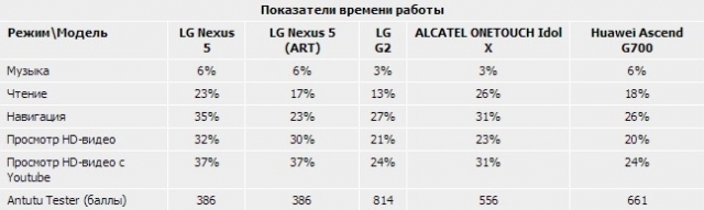 У синтетичному тесті Antutu Tester смартфон LG Nexus 5 набрав 386 балів, пропрацювавши під максимальним навантаженням дві години і десять хвилин. Провести тест Antutu Tester якимось дивом вдалося тільки один раз, при наступних тестах смартфон при 80% заряду примусово відміняв тестування, посилаючись на те, що додаток сильно перевантажує процесор.