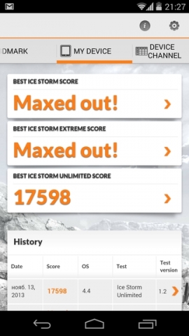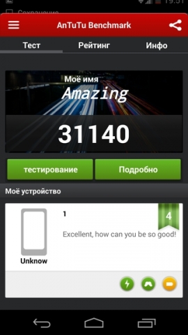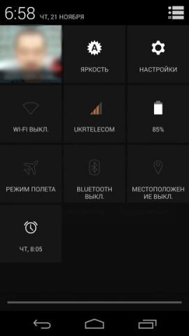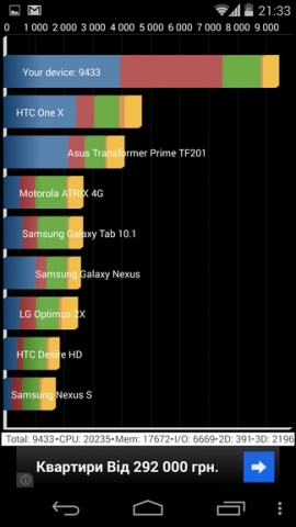 Яскравість підсвічування матриці можна встановити на рівні від 10 кд / м2 до 423 кд / м2. І мінімальне, і максимальне значення яскравості комфортні для роботи в повній темряві і при яскравому зовнішньому освітленні відповідно. 50% яскравості відповідає підсвічування силою 219 кд / м2. Яскравість підсвічування можна змінювати як вручну, так і автоматично, активувавши датчик рівня освітленості, розташований над екраном смартфона. Працює датчик освітленості коректно, але зміна яскравості підсвічування відбувається із затримкою в два-три секунди. При цьому варто відзначити, що яскравість підсвічування, що встановлюється датчиком освітленості, завжди трохи вище, ніж та, яка потрібна при певних умовах роботи. Висока яскравість, звичайно, радує, але і розряджається пристрій в такому випадку набагато швидше. Наприклад, при роботі зі смартфоном в повній темряві (читання електронної книги вночі) датчик освітленості вважає, що комфортна яскравість дорівнює 43 кд / м2, хоча вручну її можна ще трохи знизити, забезпечивши більшу комфортність для очей.