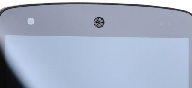 Фронтальна панель пристрою повністю накрита захисним загартованим склом Corning Gorilla Glass 3, які мають якісне олеофобним покриття. По периметру захисного скла проходить пластикова рамка, до якої воно впритул прилягає. Дана рамка не піднімається над поверхнею захисного скла, а виконана урівень з ним, з чого можна зробити висновок про те, що вона виконує тільки одну функцію - захисту країв скла Corning Gorilla Glass 3 від відколів. При цьому рамка, через специфіку своєї форми, не захищає поверхню від потертостей, коли смартфон лежить дисплеєм вниз. Над екраном розташовані комунікаційний динамік круглої форми, вічко фронтальної камери, датчик освітленості і датчик наближення. Під екраном знаходиться тільки світлодіодний індикатор пропущених подій. Кнопки управління смартфоном LG Nexus 5, як і в інших смартфонах лінійки Nexus, інтегровані в інтерфейс операційної системи і віднімають невелику частину корисної площі екрану.