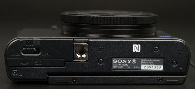На нижній панелі Sony DSC-RX100 II розташовуються слот для карти пам'яті, акумуляторний відсік, «гніздо» для штатива, отвори динаміка і майданчик для NFC-з'єднання.