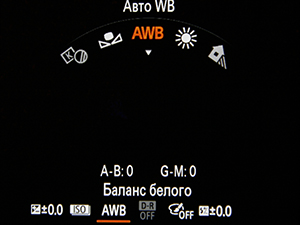 Налаштовувати баланс білого можна як через головне меню, так і через швидке (функціональне) меню. У камері є наступні пресети балансу білого: сонячно, 4 варіанти флуоресцентних ламп, хмарно, лампи розжарювання, тінь, спалах. Колірну температуру можна встановлювати вручну, вибираючи значення в діапазоні від 2 500 до 10 000 K з кроком 100 K.