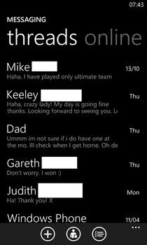 Додаток для відправки текстових повідомлень досить просте, воно являє собою список людей, від яких ви отримували СМС. Натиснувши на один з контактів, ви відкриєте ваш діалог з цією людиною. Повідомлення відображаються білим текстом на чорному тлі. У цьому ж додатку є можливість спілкування в Facebook і MSN Messenger. Від подібних програм і не потрібні ніякі додаткові функції, а це додаток відмінно справляється зі своїми завданнями.