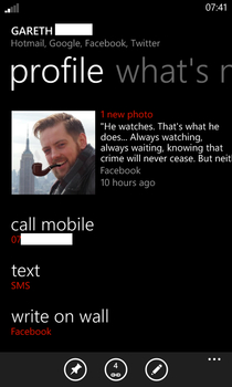 Персональний профіль контакту можна заповнювати такий додатковою інформацією, як телефонні номери, електронні адреси, місце роботи і так далі. Якщо контакт має аккаунт у соціальній мережі, тут же будуть відображатися його останні оновлення.