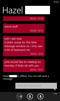 Для відправки повідомлень в Nokia Lumia 925 служить додаток Messaging. Тут ви зможете подивитися всі повідомлення, є тут і доступ до чату Facebook. Повідомлення відображаються у вигляді різнокольорових бульбашок з текстом. Є можливість голосового набору повідомлень.