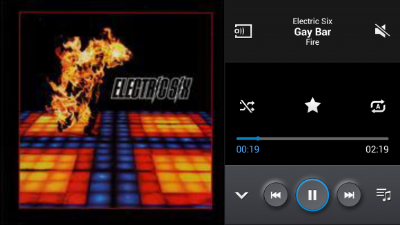 Натисніть на панель відтворення і відкриється повний екран управління піснею, в якому будуть присутні стандартні опції: відтворити / зупинити, пропустити, повторити, перемішати. Натиснувши на зірочку під зображенням обкладинки альбому, ви переміщаєте пісню в обране. Крім того, є такі додаткові опції, як SoundAlive, зміна швидкості відтворення і Smart volume.