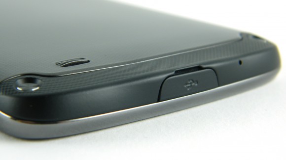 Смартфон трохи товщі, ніж S4 (9,1 мм проти 7,9 мм) і важче на 20 грам (153 грама проти 133 грам). Конструкція, однак, не особливо відрізняється. Корпус зроблений з полікарбонату, є металевий ободок. На правій грані знаходиться кнопка включення / блокування телефону, на лівій - кнопка управління звуком. Тут є знімна задня кришка і прогумовані кути, які на деякий час вбережуть ваш телефон від подряпин. Кришка текстурірована і виглядає як металева, але це звичайний пластик.