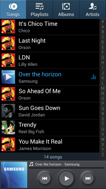 Для того, щоб ви насолоджувалися музикою, в телефоні встановлено додаток Music, що володіє багатим функціоналом. Пісні можна сортувати за назвою, виконавцем, альбомом, плейлистам. Натисніть на пісню і нагорі екрану з'явиться панель відтворення, що дозволяє одночасно продовжувати переглядати вашу музичну колекцію і управляти відтворенням пісні.