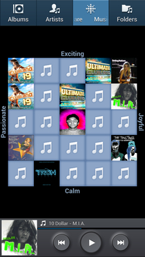 Ще одна функція Music Square проводить аналіз вашої музичної бібліотеки і розділяє всі пісні за емоціями (Радість, Пристрасть, Спокій і Восторг), щоб можна було запропонувати вам музику під настрій.