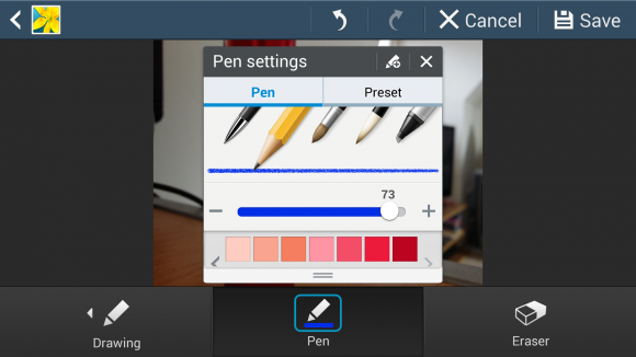 Третя додаткова функція стилуса. Натисніть на неї, і все що знаходиться на дисплеї збережеться в галереї. Це більше ніж просто можливість зробити скріншот. Ви можете, наприклад, обвести зображення в статті за допомогою S Pen і телефон збереже картинку в додаток Scrap Booker, разом з адресою сайту, на якому ця стаття була. На збережених зображеннях можна писати, вибираючи вид і товщину кисті, а також колір чорнила.